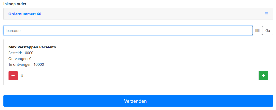 Selecteer het aantal artikelen wat is binnengekomen en druk vervolgens op verzenden: