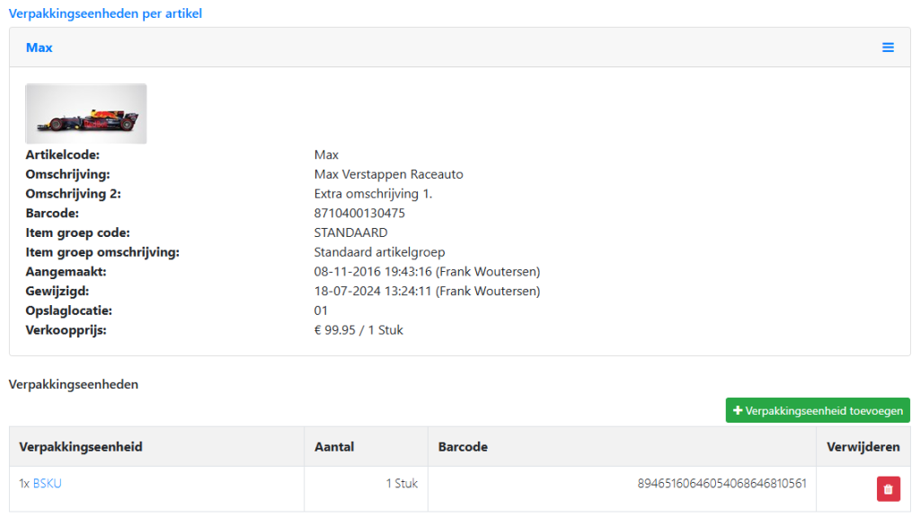 Na de import is de verpakkingseenheid BSKU nu aangemaakt bij het bovenstaande artikel. De barcode die is ingevoerd in het extra veld in Exact Online is gebruikt als barcode veld. Voor het aantal is in dit geval de waarde 1 toegepast.